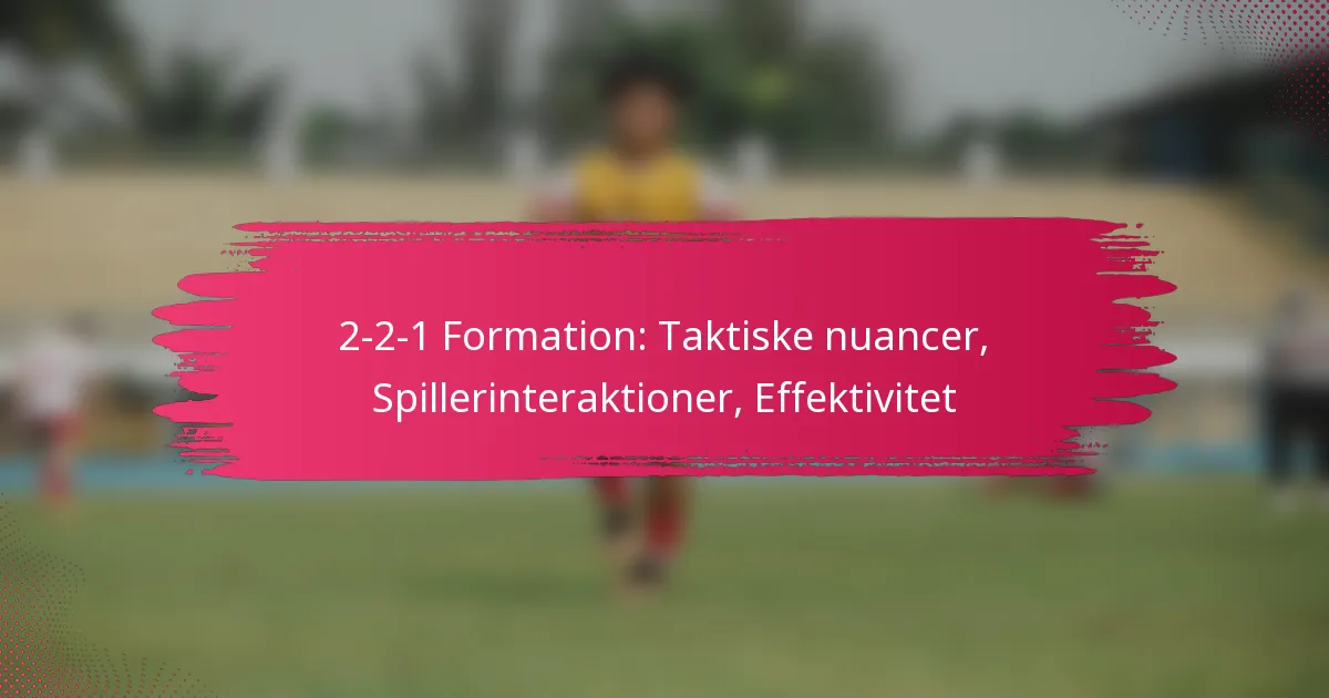 2-2-1 formationen er en taktisk opstilling, der består af to forsvarsspillere, to midtbanespillere og en angriber, designet til at skabe balance mellem forsvar og angreb. Denne struktur letter ikke kun effektiv boldkontrol og overgangsspil, men forbedrer også pladsstyring, hvilket gør det muligt for hold at tilpasse deres strategier mod forskellige modstandere. At forstå de forskellige roller og interaktioner mellem spillerne inden for denne formation er essentielt for at optimere dens effektivitet i forskellige spilsituationer.